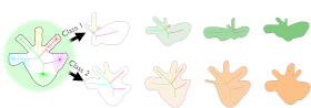 The following code shows how to create shape variants by manipulating a shape's skeletal representation. The skeletal representation decomposes the shape into parts. Here we vary the relationship of the lengths, orientations, widths, and positions of all these parts to create new shape variants.